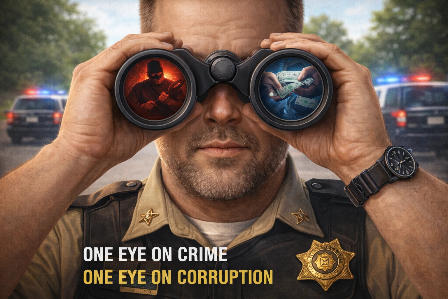 Illustrative imagery representing James Samples living up to his Campaign Promise of keeping “One Eye On Crime and One Eye On Corruption”